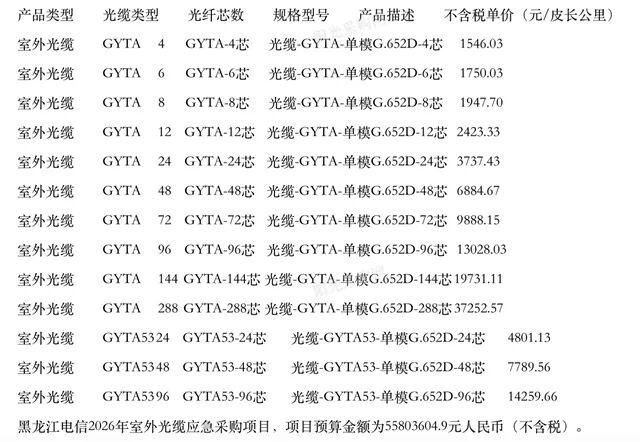 近日,中国电信集团黑龙江电信分公司发布2026年室外光缆应急采购项目招标公告。