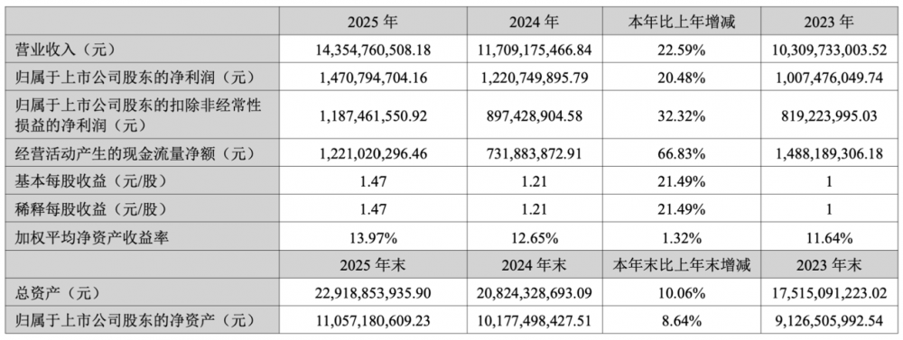 华工科技公布2025年业绩。报告期内,华工科技聚焦“联接、感知、智能制造”三大核心业务,实现营业收入143.55亿元,同比增长22.59%,归属母公司净利润14.71亿元,同比增长20.48%。