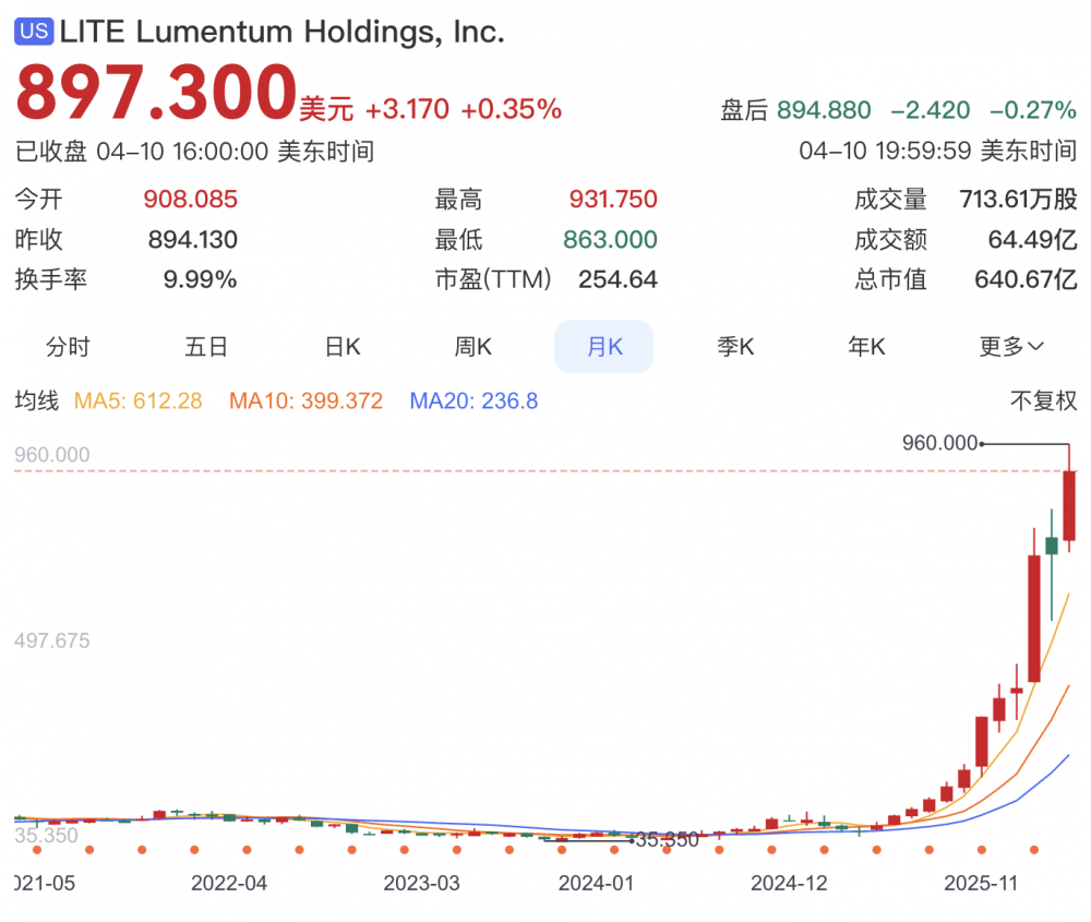 Lumentum供应先进的InP器件,随着光互连日益被视为未来先进云计算集群的首选网络技术,Lumentum的股价过去一年已上涨15倍左右。