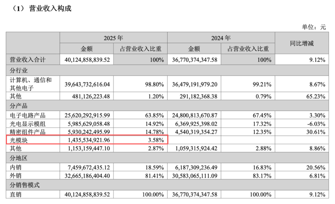 公告显示,2025年,东山精密光模块收入为14.36亿元,占营收比为3.58%。