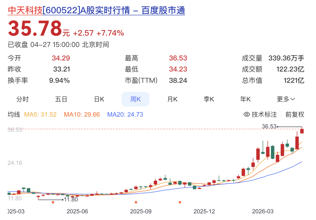 受益一季度的出色业绩表现,中天科技股价今日开盘后涨停,创下历史新高,最新市值为1247亿元。截至今日收盘,中天科技涨7.74%,股价35.78元/股。
